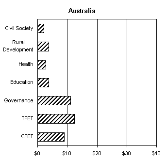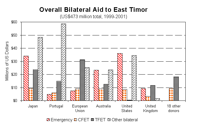 In this Bulletin, we present an overview of the aid given specifically to East Timor from various national donors for the past two years. This turned out to be a difficult task. We have tried to convert the data to a consistent format, but approximations and presumptions remain. All graphs and figures are in millions of United States dollars. The figures below represent, as closely as possible, bilateral donations received by East Timor between October 1999 and the end of October 2001. We have omitted assessed and other contributions to the UNTAET or InterFET trust funds. We are including, however, donations specifically designated for East Timor made through multilateral agencies, TFET (Trust Fund for East Timor) or CFET (Consolidated Fund for East Timor).