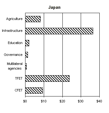 Japan also pledged to contribute $100 million to rehabilitation and development in East Timor over 3 years from 2000 to 2002. More than $68 million has already been disbursed, including $9 million to CFET and $24 million to TFET. Additional Japanese assistance to rehabilitation and development has been given through UN agencies such as UNDP, FAO and UNICEF, as well as by the Japanese Mission and Japan International Cooperation Agency (JICA) directly. Priorities of Japanese assistance are infrastructure, agriculture and human resources development, and most assistance fall within these categories.