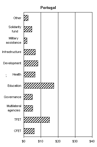 Although most of the assistance for East Timor comes from the national government’s budget, donations from Portuguese civil society created the Solidarity Fund (which is administered by CATTL) to finance various projects in “social support and humanitarian action.” The $4.8 million reported for the Solidarity Fund only reflects activity until the end of year 2000, as La’o Hamutuk was unable to obtain more recent information on the activities of this fund.