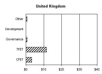 The United Kingdom (Great Britain and Northern Ireland) supplies most of its aid to East Timor through the TFET and CFET trust funds, and does not earmark it for specific sectors or programs. British aid is not tied to UK goods or services. The UK also provides scholarships for East Timorese to study in England, and funded the King’s College London study on East Timor’s defense needs.