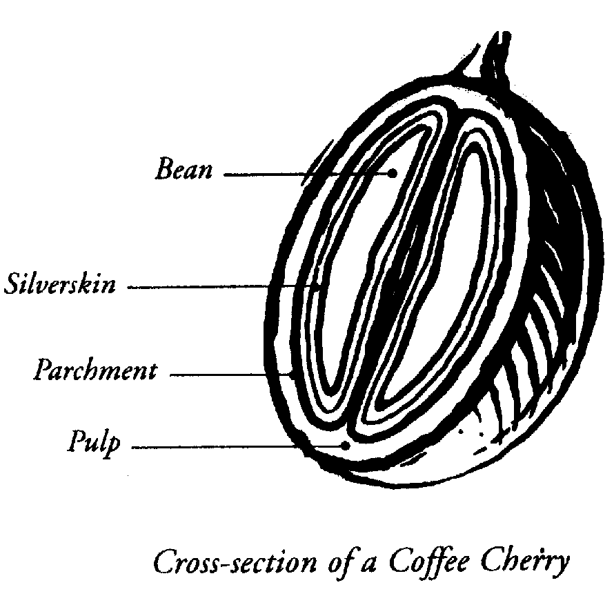 ![]() | When the coffee cherry is picked from the tree, initial processing removes the pulp, and the coffee is in parchment form. The layers of parchment and silverskin are removed in further processing, leaving just the green bean. The green bean is then exported for roasting, grinding, brewing and drinking. |