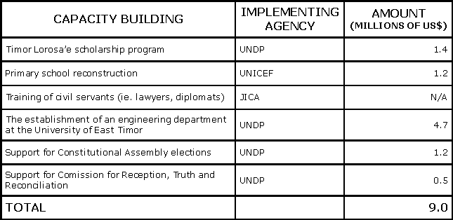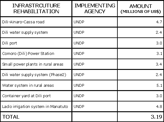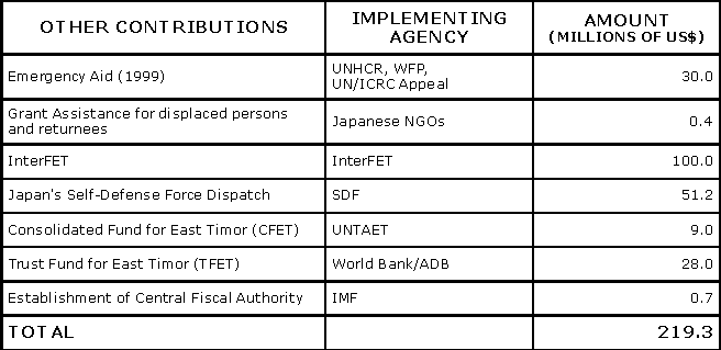| * All of the figures in the tables, except the details for contributions to infrastructure rehabilitation, come from an April 2002 report "Japan’s Contribution to East Timor" from the Government of Japan. Infrastructure rehabilitation details come from other Japanese Government reports. |