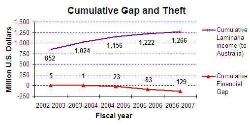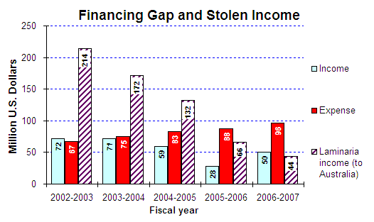 | The upper graph shows East Timor’s government’s actual and projected annual income and expenses and Australia’s revenues from the Laminaria-Corallina oil field. For each year, the difference between left bar (income) and middle bar (expense) represents the deficit -- if expenses are higher than income, the government needs more money. The expense budget increases slightly for each year, as is normal, but the income budget drops from 2004 for the next three, as donor money decreases and revenues from Bayu-Undan construction taxes decline. From 2006 onward, income increases from Bayu-Undan oil production. The third (striped) bar represents what the Australian government receives from Laminaria-Corallina, in disputed territory but closer to East Timor than to Australia. This declines each year as most of Laminaria’s oil has already been sold. Australia received $638 million between 1999 and 2002, not shown on the graph. East Timor has not received one cent. The lower graph shows the total budget deficit and Laminaria income, with each year added to the accumulated number from previous years. It is clear that the $1.266 billion Australia will have stolen from Laminaria by 2007 could pay East Timor’s $129 million budget gap many times over. |