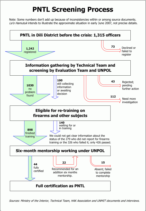 According to the Timor-Leste Government, the priority of the screening process is PNTL personnel from Dili District and the PNTL headquarters. That this been finished, and PNTL from other districts are now undergoing screening, with about 30% of the PNTL officers in the districts having been screened by mid-June.