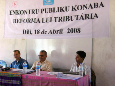 OCAP Program Manager José Reinaldo Soares, despite promising to speak on behalf of OCAP, did not attend the meeting or give advance notice beforehand that he would not come. OCAP Program Coordinator Koen Toonen declined La'o Hamutuk's invitation. While participants were disappointed that key OCAP decision-makers did not attend, they energetically discussed their thoughts. In general participants were content for the government, especially the Ministry of Agriculture, to continue OCAP, but they felt that stronger mechanisms for working with the community and evaluation were required. They particularly stressed the need to evaluate the Self-Help Groups, as many of these were inactive during the program. The public meeting provided the Oecusse community with a positive opportunity to voice their opinions and criticisms on OCAP. During the project implementation they were aware of, and raised, many problems with the project which were not followed-up, and we hope this experience will encourage communities' active participation in the future. Public Meeting Discusses Proposed Tax Reform LawLink to La'o Hamutuk index page on the tax reform legislative process. The Timor-Leste NGO Forum (FONGTIL), La'o Hamutuk and Forum Tau Matan (FTM) organized a Public Meeting on the proposed Tax Reform Law on 18 April 2008 in at the University of Dili. The meeting drew more than fifty participants, including university students, journalists, representatives of NGOs, local communities, and civil servants. The speakers included Dr. Rui Gomes (Coordinator of the Government's team who drafted the Tax Reform Law), Dr. Tobias Rasmussen (IMF Country Manager) and Viriato Seac of La'o Hamutuk, representing Civil Society Organizations. The organizers also invited representatives from National Parliament, but they did not attend.