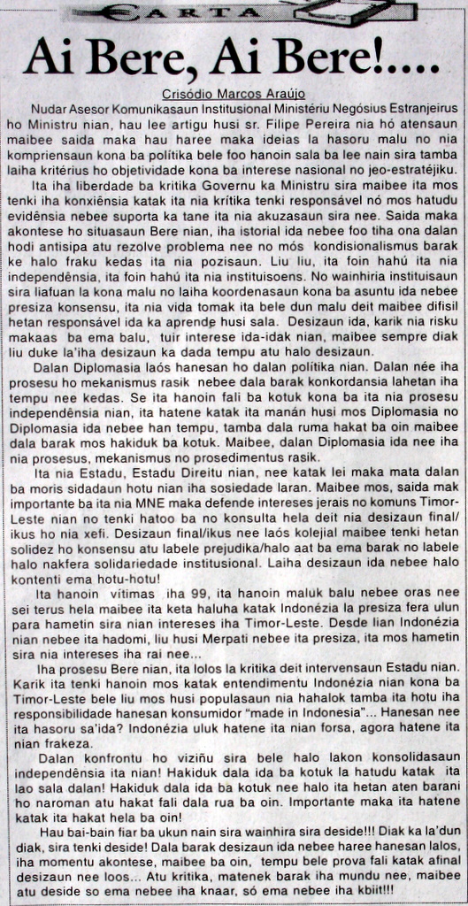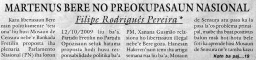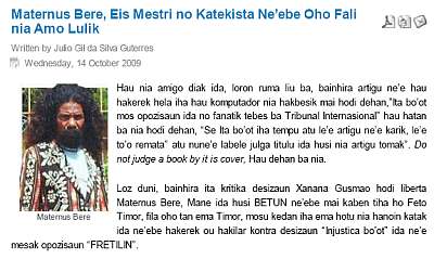| Timor Post 20 Oct 2009 | Maternus Bere and national concerns by Filipe Rodrigues Pereira | |