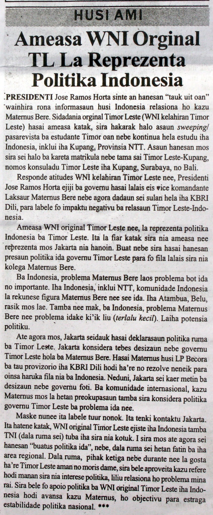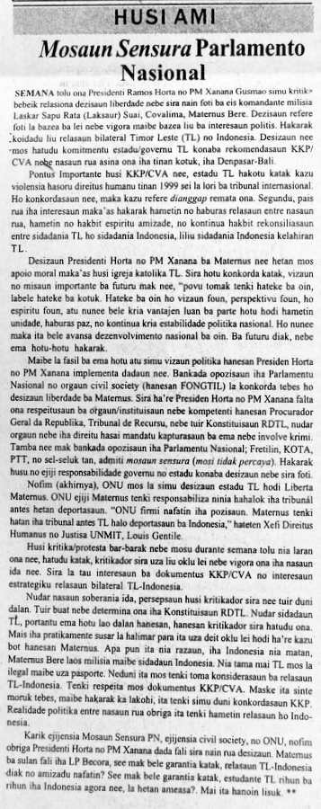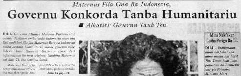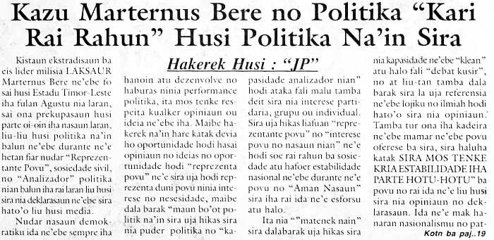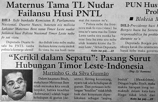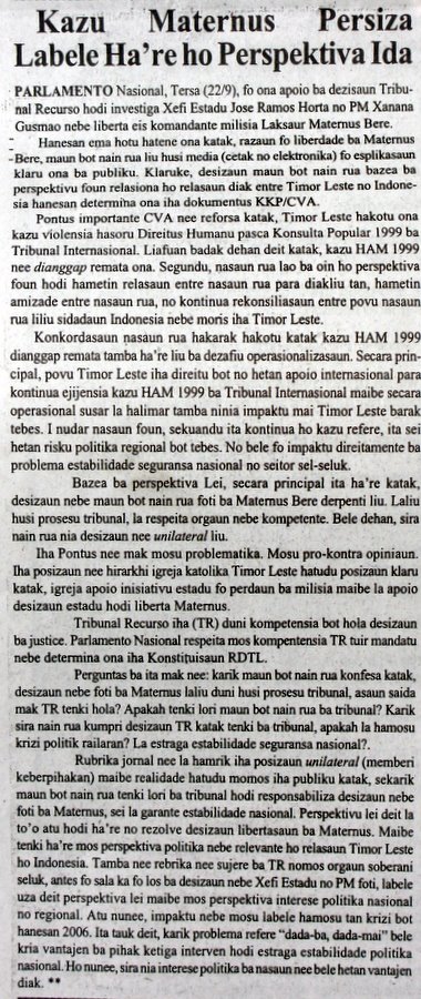 | Timor Post 22 Sept 2009 | Maternus Bere case and the Policy of "Throwing Dust" from Political Leaders By "JP" | |
