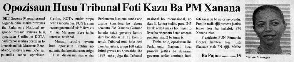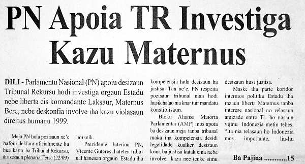 | Timor Post 15 Oct 2009 | Case of Maternus Bere PUN: Public Prosecutor can bring Xanana to court | |