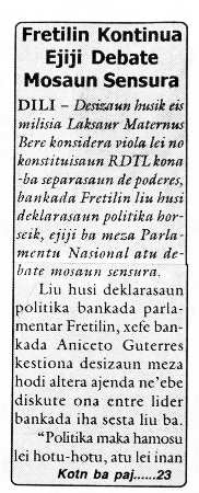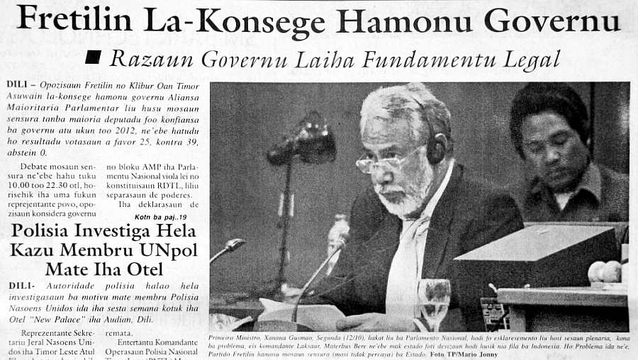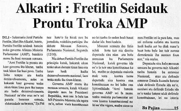 | Timor Post 13 Oct 2009 | Fretilin unsuccessful in bringing down Government Government's reason has no legal foundation | |