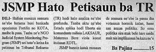 | Suara Timor Lorosa'e 14 Oct 2009 | JSMP Submits petition to Appeals Court | |