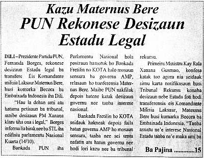 | Suara Timor Lorosa'e 15 Oct 2009 | Case of Maternus Bere PUN recognizes decision of state is legal (This is a typo. As the article makes clear, PUN says the decision was ILLEGAL.) | |