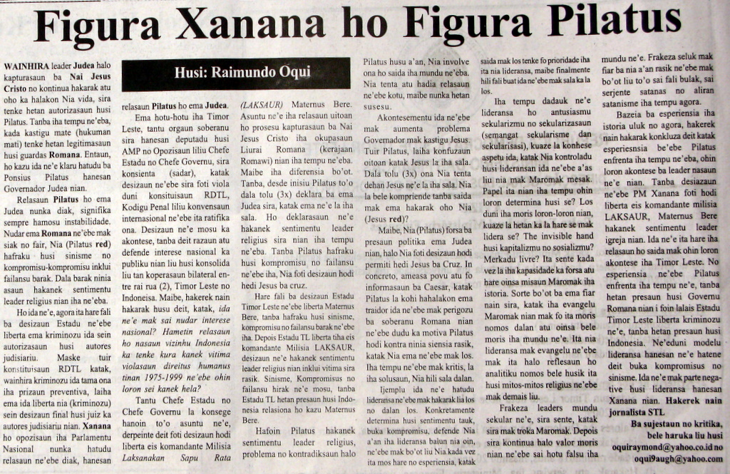| Suara Timor Lorosa'e 23 Oct 2009 | The figure of Xanana with the figure of Pilate by Raimundo Oqui | |