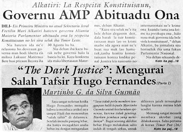 | Timor Post 13 Oct 2009 | Alkatiri: No respect for Constitution, AMP Government's habit already "The Dark Justice": Untangling wrong ideas of Hugo Fernandes | |