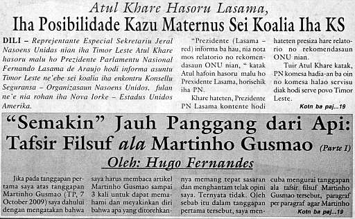 | Timor Post 16 Oct 2009 | Atul Khare meets Lasama, It's possible Maternus case will be discussed in the UN Security Council The food is "so far" from the fire: interpreting philosopy accprding to Martinho Gusmao | |