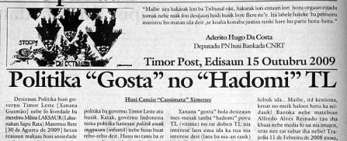 | Timor Post 17 Oct 2009 | Politics of "want" and "love" Timor-Leste By Cancio "Cassimata" Ximenes | |
