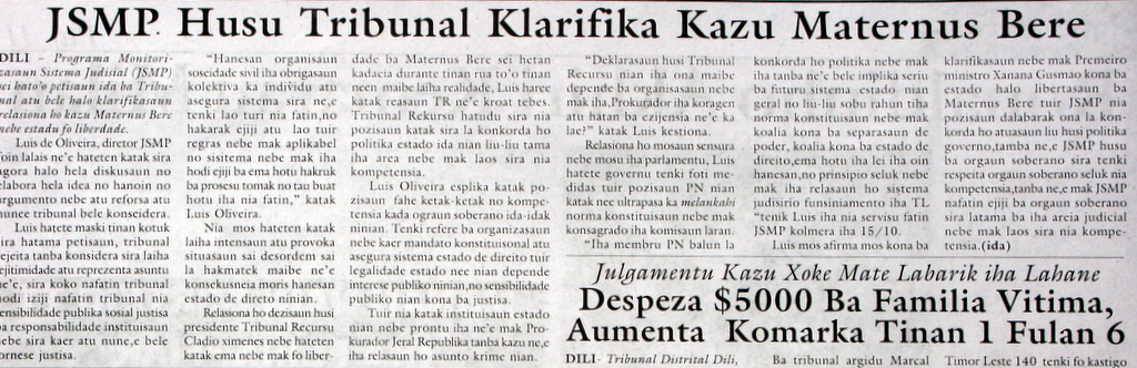 | Timor Post 20 Oct 2009 | JSMP asks court to clarify the Maternus Bere case | |