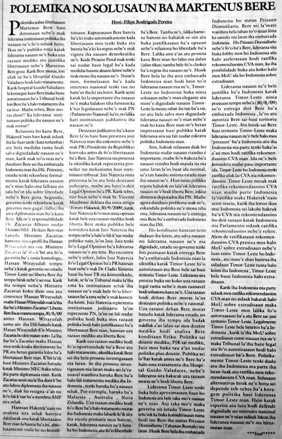 | Timor Post 7 Oct 2009 | Polemics and Solution for Maternus Bere by Filipe Rodrigues Pereira | |