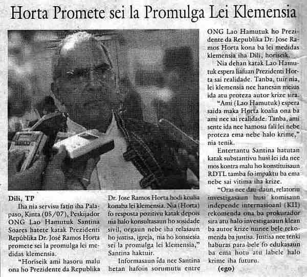 Link to Clemency Law index page, including text and translation of law. Horta Promises not to Promulgate Clemency Law Timor Post, 6 July 2007