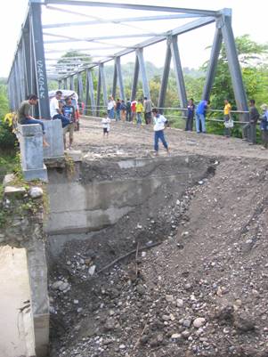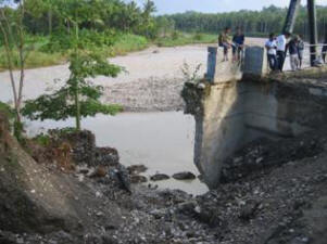 | On 16 May 2006, the team found the road from Viqueque to Beaçu on the southern coast to be impassable due to an almost complete collapse of the road embankment (see Figure 33) of the Motale’e bridge. The design of the bridge, built ten years ago during Indonesian times, displayed insufficiently extended flanges, thus providing inappropriate containment for the soil behind the bridge south support wall. Erosion of the river bend at the embankment toe combined with inadequate drainage caused the road to collapse, which was reduced to a section of about 1.5m in width. Small vendors congregated at the bridge waiting to catch a ride with vans that venture through the remaining gap when the soil is dry. Local officials had informed authorities in Dili about this several weeks earlier and were waiting for a response, since there was no local capacity to repair the road. This incident exemplifies both the fragile state of the Timorese civil infrastructure and the limited local and national capacity to respond to natural disasters, industrial accidents, or infrastructural failure. | | | |