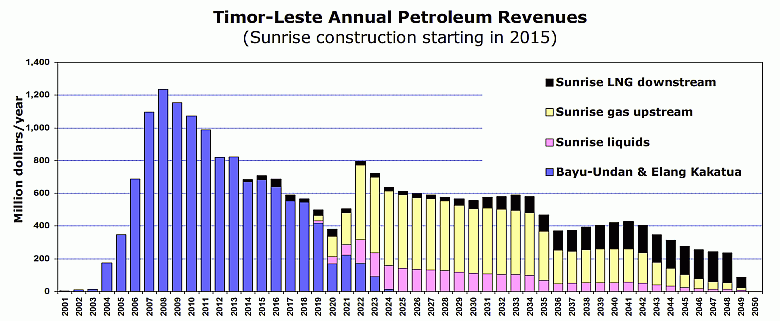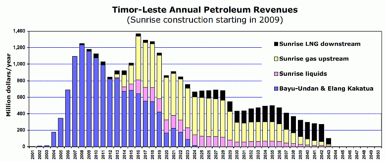 As La’o Hamutuk recommended in our “Case for Saving Sunrise” paper [94], Timor-Leste would gain by extending the period of Sunrise production by starting later and reducing the rate at which gas is extracted and liquefied. Timor-Leste will benefit more extensively from operating than from construction, and a longer project lifetime allows for more Timorization. A single 3.5 mtpa train, with a smaller-diameter pipeline, would be less costly to build than the 5.3 or 7 mtpa plant capacities that have been suggested. Timor-Leste would also benefit more if the project started later, giving us more time to prepare to receive its benefits. Although these options may be less preferable for the companies, they would be better for Timor-Leste’s people. At present, the Estimated Sustainable Income (ESI) to Timor-Leste from oil and gas projects under contract (primarily Bayu-Undan) is about $300 million per year, as described in the Petroleum Fund Act. [73] The ESI will increase to about $550 million/year when a Sunrise Development Plan is agreed, as the anticipated Sunrise revenues will then be included. If that Plan includes an LNG plant in Timor-Leste, the annual ESI would be about $625 million. All of these numbers are far beyond the capacity of the Government to execute programs responsibly, and the amount actually spent over the next several years is likely to be considerably less than the ESI. As the following two graphs show, the income Timor-Leste receives from Bayu-Undan alone is far above the ESI for the next decade, and Greater Sunrise will provide additional income for another couple of decades. However, if Greater Sunrise is developed as quickly as possible (see Figure 24), its revenues will overlap those from Bayu-Undan, creating a revenue peak which will be deposited into the Petroleum Fund. In this case, Sunrise revenues will stop when the gas is exhausted, about 35 years from now. Figure 25 shows an alternative, delaying the start of construction until 2015, with production starting in 2020. In addition to providing six more years of income, this delay would have several advantages for Timor-Leste: It would allow more time to train our workforce and develop secondary businesses, increasing the share of revenues which would come into our economy. It gives time to develop, pass, implement and gain experience with environmental laws and other legal prerequisites for a successful LNG project. It gives our administrators and regulators more time to develop their capacities and experience, so that they are better able to ensure that the project serves Timor-Leste’s interests. It allows us to take advantage of improvements in rapidly-developing LNG and deep water pipeline technology. It will probably result in less expensive construction and higher revenues, as current very high construction costs (see Box 12) are likely to drop after a few years. It is likely to result in increased income, as the sales price of oil and gas is almost certain to go up over the long term. Finally, if development is delayed Timor-Leste could request renegotiation of the CMATS treaty, allowing us to achieve our right to a maritime boundary and secure a greater share of our natural resource entitlement.