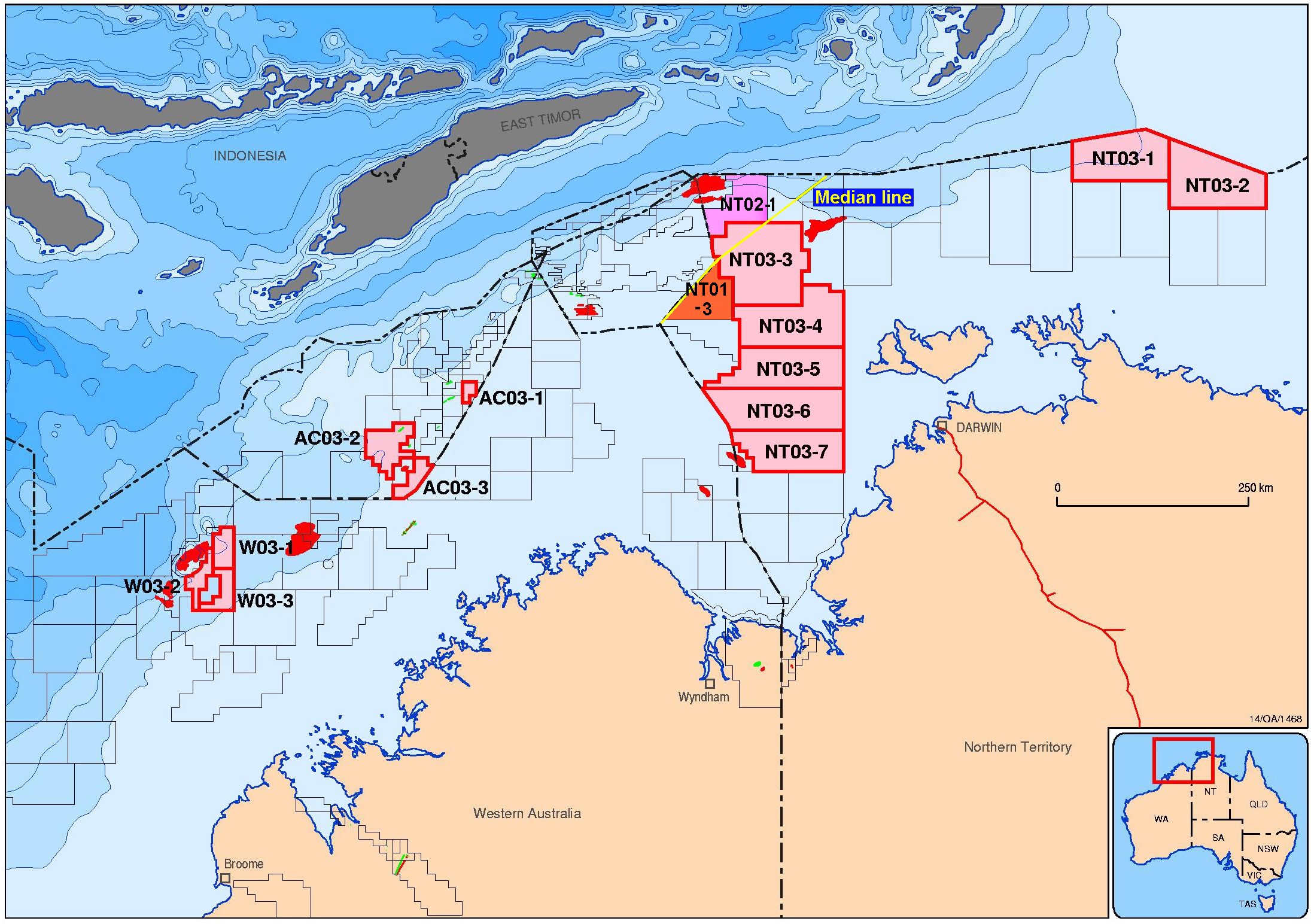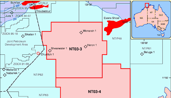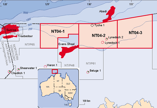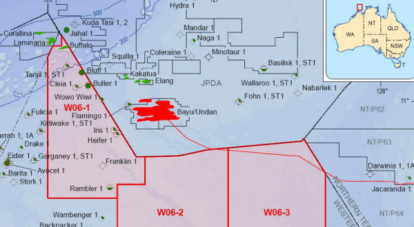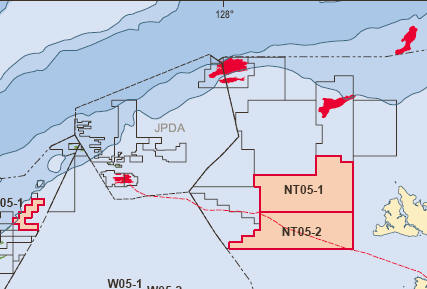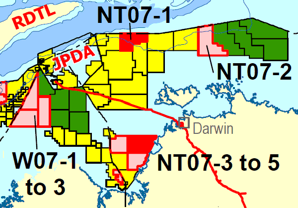 See below for details of new areas released in 2001 2002 2003 2004 2005 2006 2007 2001In the 2001 release, only a corner of NT01-3 intrudes into East Timor's territory. On 20 September 2002, Australia awarded a contract for this area, now called NT/P62, to National Oil & Gas Pty Ltd (35%, operator), Australian Natural Gas Pty Ltd (35%), and Nations Natural Gas Pty Ltd (30%). These partners proposed a guaranteed program for the first three years of 500km 2D seismic survey and geoscience studies at an estimated cost of $1.15m. The companies also proposed a secondary program of 1 well and studies at an estimated cost of $15.45m. There were no other bids for the area. 2002Australia's 2002 release also intrudes on East Timor's territory. Nearly all of NT02-1, adjacent to Greater Sunrise, would belong to East Timor with a fair, legal boundary settlement. The following map shows their Northern Territory areas. See the larger-scale map above for details.