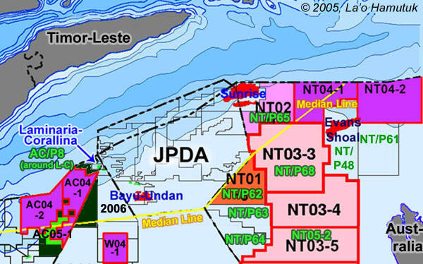 Australian Offshore Petroleum ReleasesEvery March, the Australian government makes new undersea areas available for oil companies to sign contracts so that they can explore the seabed for oil and gas resources. If they find anything, the companies are then allowed to extract it, with royalties and taxes going to the government. Although Australia pretends that these are within Australian territory, each of the last three annual releases have included areas north of the median line between Australia and East Timor, which will likely be within East Timor's Exclusive Economic Zone when boundaries are settled in line with international legal principles.