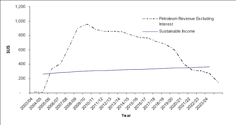 The petroleum wealth, including that estimated to be in the petroleum fund as at 30 June 2006 is calculated at $9.4 billion, the sustainable level of petroleum income for the 2006-07 fiscal year is estimated at $283m. The withdrawal of $259.7m is below the sustainable petroleum income level, the estimates of the Government show that financing required for the period 2006-07 to 2009-10 is below the level of sustainable income. This is illustrated in Table 1.5 and Chart 1.1