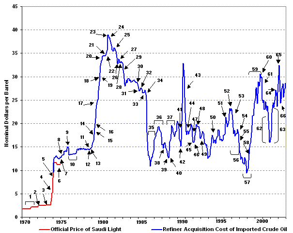 - Continued unrest in Venezuela and oil traders' anticipation of imminent military action in Iraq causes prices to rise in January and February, 2003.