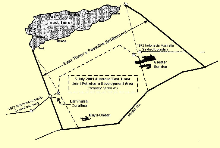 A recent Dili seminar (23 March 2002) sponsored by PetroTimor (see page below), presented different information, raising concerns about the proposed Arrangement and what it may cost East Timor in lost revenues. According to the oil industry experts who spoke at the seminar, signing this Arrangement would jeopardize the settlement of East Timor’s maritime boundaries under principles of international law. In the seminar, experts argued that by signing the Arrangement, Australia will have a stronger claim to maintain the boundaries in the treaty as international maritime boundaries, thus ensuring Australian rights to some of the largest and most lucrative oil and gas fields, namely the Greater Sunrise and Laminaria-Corallina fields with a potential revenue of up to US$38 billion (see Map 2).