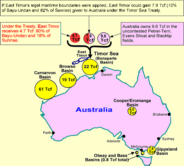 back to top Four-Fifths of Australia’s Gas is Outside the Timor Sea The oil and gas in the Timor Sea are the only significant petroleum resources available to East Timor, and East Timor’s future depends on these revenues. Australia, on the other hand, has four times as much gas in other parts of its territory, as shown on the map below. Circles show the location of Australia’s “Proven and Probable” (2P) reserves of natural gas, where gas underground or undersea could be extracted and sold. The size of each circle represents the amount of gas in Trillions of Cubic Feet (Tcf). Oil reserves are not shown. Australia has about 110 Trillion cubic feet (Tcf) of natural gas, with a value of approximately U.S. $850 billion ($850,000,000,000). This could produce about $400 billion in government revenues. Australia has much more gas than it can consume domestically, so most Timor Sea gas will be exported to Japan. One-fifth of Australia’s gas, 22 Tcf, lies under the Timor Sea. Some is in Australian territory and some in the “Joint Petroleum Development Area” shared between East Timor (90%) and Australia (10%) under the Timor Sea Treaty and Greater Sunrise Unitization Agreement. The Treaty gives revenue from 4.7 Tcf of Timor Sea Gas to East Timor and 17.5 Tcf to Australia. If East Timor’s full maritime boundary entitlement was were applied instead, 7.9 Tcf of this 17.5 could belong to East Timor.
