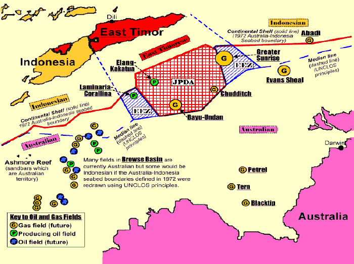 Australian Zones which belong to a particular country without question are labeled as such. Producing and future oil and gas fields are shown as circles, next to the underlined field name or connected by an arrow. Larger circles have more resources. The heavy solid line is the Australia-Indonesian seabed boundary, negotiated in 1972. Although this line is based on outdated principles and closer to Indonesia than to Australia, it is still in effect. The lighter dashed line is the median line, halfway between the shorelines of Australia and Indonesia or East Timor. This line was agreed by Indonesia and Australia in 1997 as their "EEZ" boundary for resources within (not under) the sea. If current Law of the Sea principles were applied, this would be the seabed boundary. There are many oil and gas fields in the Browse Basin south of West Timor. Because of the 1972 treaty, these belong to Australia, although some are closer to Indonesia. Since 1931, Australia has controlled four tiny uninhabited islands called Ashmore Reef. As a result, Australia’s economic zone extends close to Roti and West Timor, including many oil and gas fields.
