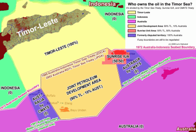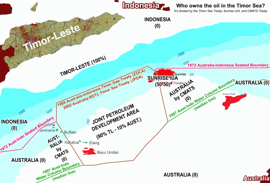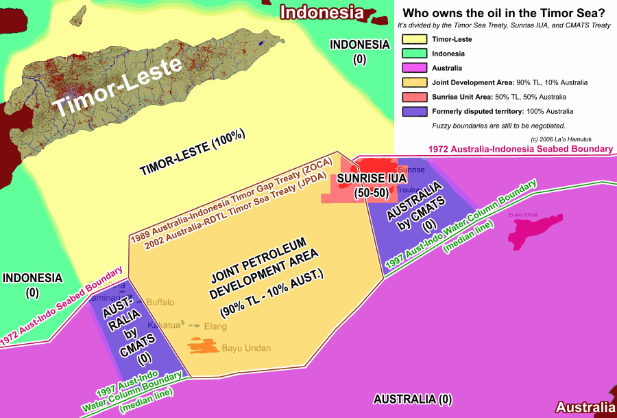 Duration: Article 12 makes CMATS effective for 50 years after its ratification and entry in to force, although this can be shorter if Sunrise production has not started within 10 years or ends less than 45 years after CMATS enters into force. If both countries agree, CMATS can be extended longer. Under CMATS Article 3, the 2002 Timor Sea Treaty (which was due to expire in 2033 or sooner, if maritime boundaries had been established) is extended for as long as CMATS is in effect. (see timeline). The 50 year duration appears to be based on commercial grounds, providing certainty for oil companies to explore and exploit petroleum resources without any changes of ownership until the oil and gas is used up. It is consistent with the duration of the previous Timor Sea Treaty and Timor Gap Treaty, as well as with oil and gas project lifetimes. Legalizing Australia's exploitation of disputed areas: In a confusing way, the CMATS treaty includes Timor-Leste's acceptance of Australian petroleum activities in formerly disputed areas outside the JPDA. Article 4.2 says that both countries' domestic legislation regulating existing undersea resource activities and authorizing new ones is in effect as it was on 19 May 2002 — the day before RDTL became a sovereign nation. Side letters between the two Foreign Ministers confirm that Timor-Leste had no such legislation on that date, while Australia had specific laws, including its 1972 treaty with Indonesia (see map 2) and its 1967 and 1994 petroleum laws. As a result, Australia is allowed to continue petroleum exploitation in these areas, while Timor-Leste surrenders its claim. This provision of the Treaty appears unnecessarily obscure. Distribution of Sunrise revenues: Article 5 of CMATS says that the parties will share the upstream income from the Sunrise Unit Area equally. Each country will collect revenues according to its own taxation laws and the 2003 IUA (which assigns 18% of Sunrise to Timor-Leste and 82% to Australia), and then Australia will pay Timor-Leste so that each country ends up with an equal amount. For example, if Australia received $82 million and Timor-Leste $18 million in a particular quarter, Australia would then pay Timor-Leste $32 million so that each country would end up with $50 million. The revenues discussed in Article 5 are from "upstream exploitation" — that is, the value of the oil and gas at the valuation point when it comes out of the well, prior to entering any pipeline or ship. Article 6 and Annex I give more details of how this revenue allotment will be implemented, and a mechanism for resolving differences between the two countries. Fishing rights: CMATS Article 8.1(b), together with Annex II, divides the water column resources (including fish) between the two countries along the southern edge of the JPDA, allowing Timor-Leste fishermen to work inside the JPDA, provided that their activities do not inhibit petroleum activities. The Treaty does not specify fishing rights in the previously contested lateral areas east and west of the JPDA. In 1997, Australia signed a treaty giving Indonesia water column rights in these areas, but it was never ratified, leading to the current ambiguity. Timor-Leste and Indonesia have not yet negotiated water column rights off the north, east, and south coasts of Timor-Leste. This negotiation could also resolve the question with Australia, if Australia continues to accept the water column boundary it agreed to with Indonesia in 1997. Maritime Commission: CMATS Article 9 creates this Commission, with one person appointed by each country. It meets annually to review the status of maritime boundary arrangements (but not to change them), and consult on security, environment, resource management and other issues. Its mandate includes both renewable (fish) and non-renewable (oil and gas) resources, as well as the promotion of sustainable management strategies. The Maritime Commission has no authority regarding the exploration and exploitation of petroleum from Greater Sunrise. These decisions are assigned to the Sunrise Commission which is created by Article 9.2 of the Sunrise International Unitization Agreement. The Sunrise Commission, which has two Australian and one Timor-Leste members, coordinates the work of the "regulatory authorities" in the IUA — that is, the Australian government and the Timor Sea Designated Authority (TSDA). If there is a disagreement which cannot be resolved by the regulatory authorities or the Sunrise Commission, it can be referred to arbitration under Article 26.2 and Annex IV of the IUA. CMATS dispute resolution: In contrast with the IUA, the CMATS treaty prohibits arbitration or judicial involvement except in one narrow instance. Rather, it requires that disputes about the CMATS treaty be settled by consultation or negotiation, a process which is almost always biased in favor of the more powerful party. However, disputes about the collection and distribution of tax revenues from Greater Sunrise can be resolved by an assessor — an arbitrator appointed by both countries or by an impartial international agency. Critiques of the CMATS treaty As soon as the treaty was announced, supporters of Timor-Leste's rights criticized Australia for continuing to bully Timor-Leste. The Australian Timor Sea Justice Campaign called the deal "another sad chapter of Australian foreign policy betrayal" and described it as "a 'stop gap, band aid' solution that will enable the commercial development of the Sunrise field without the Australian Government acknowledging Timor-Leste's sovereign rights to this and other fields on Timor-Leste's side of the median line. Not only has the Australian Government refused to negotiate permanent maritime boundaries until a time when all of the oil and gas has been taken, but it continues to unilaterally deplete the Laminaria-Corallina and Buffalo fields." In the U.S., the East Timor and Indonesia Action Network (ETAN/U.S.) continues to see this 