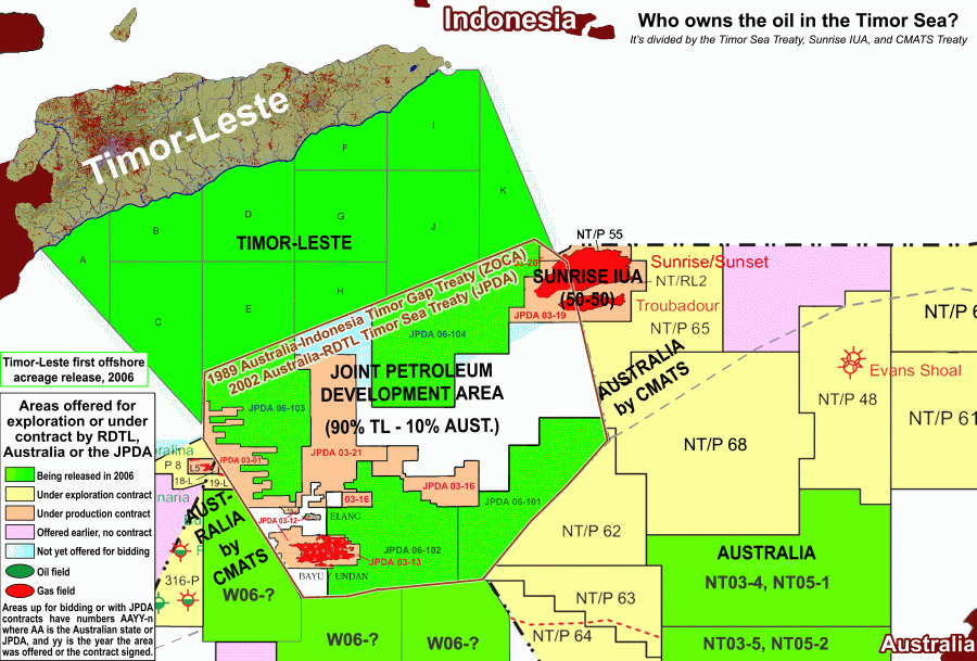 We agree with the Timor-Leste government that both countries have to improve their relationship for the future. But we cannot accept the Australian government's actions and approach. The people of Timor-Leste and Australia have had good relations for a long time. Beginning with World War II, when we helped the Australian Army fight the Japanese, Timorese people have shown their good will. And during our struggle against the Indonesian occupation, the Australian people showed their solidarity. Today, Australians are helping the Timor-Leste people in the struggle to develop our country. However the actions of the Australian government in the Timor Sea raise questions about democracy in Australia. Most informed Australian people do not agree with the position of their government. Their campaigns, supported by citizens and officials from Timor-Leste and around the world, have already moved their government. There is no reason to believe that continued campaigning, together with skillful bargaining by the Government of Timor-Leste, would not move Canberra even further. GlossaryArbitration: a method of resolving disputes where a third party, or a jointly-agreed panel, makes a decision. The two disagreeing parties agree in advance to accept the arbitrator's decision. If the parties cannot agree on an arbitrator, he/she can be appointed by an impartial international agency. CMATS: (text) The Treaty on Certain Maritime Arrangements in the Timor Sea, signed between Australia and Timor-Leste on 12 January 2006 to allocate upstream revenues from previously disputed maritime areas while deferring maritime boundary discussions. Downstream: the refining or liquification part of the petroleum process, transforming oil or gas as extracted (upstream) into a form or product that can be transported and sold to customers. Exploitation: the process of extracting oil and gas from the ground, processing it and selling it. Also production. Exploration: the process of geological analysis, seismic testing, and test wells to locate, identify and estimate the size of underground or undersea oil and gas deposits. Exclusive Economic Zone (EEZ): an area of the sea and seabed adjoining a country's land territory where the country has rights to exploit and sell the resources in and under the water. Under UNCLOS, the EEZ usually extends 200 nautical miles (330 km) from the shore. When two countries are less than 400 miles apart, a process of negotiation and/or arbitration can decide the boundary between the EEZs, which is usually along the median line. International Court of Justice (ICJ): a court in The Hague, Netherlands, where national governments can bring civil cases against one another. The ICJ has often served as a mediator or arbitrator in maritime boundary disputes. In March 2002, Australia gave notice that it would no longer accept ICJ or UNCLOS processes for arbitrating maritime boundaries. International Unitization Agreement (IUA): (text) an agreement between two countries to develop a petroleum field or fields that crosses a boundary as a single entity, applying a single system of laws, taxes, environmental standards, safety codes, labor rules, etc. to that field. When a field is developed as one project, it would be impractical for different regulations to apply on different sides of an imaginary line in the middle of the sea. Timor-Leste and Australia signed an IUA for Greater Sunrise in March 2003, but Timor-Leste's Parliament has never ratified it. The CMATS Treaty requires ratification of the Sunrise IUA. Joint Petroleum Development Area (JPDA): an area of the Timor Sea between Timor-Leste and Australia, but closer to Timor-Leste. This was defined first in the 1989 Timor Gap Treaty as Zone of Cooperation Area A, and re-established by the Timor Sea Treaty. It is now jointly developed by Timor-Leste and Australia, with Timor-Leste receiving 90% of the government revenues from upstream production. The JPDA includes the Bayu-Undan and Elang-Kakatua gas and oil fields, and about 20% of the Greater Sunrise field. See Map 1. Lateral Boundaries: the definition of which territory belongs to Timor-Leste and which to Australia in areas east and west of the JPDA. These have not been established, but would be significantly wider than the JPDA according to current international legal principles. The JPDA's edges were set by Indonesia and Australia in 1972 and 1989, without participation from Portugal or Timor-Leste. Under CMATS, Timor-Leste concedes Australia's right to extract petroleum from these previously disputed areas. Liquefaction: the process of transforming natural gas to a liquid state (LNG) for loading onto ships, done in a large factory and requiring cooling and pressure. Bayu-Undan's natural gas is liquefied at the Wickham Point facility in Darwin. No decision has been made about where the gas from Greater Sunrise will be processed. LNG (liquefied natural gas): In order to transport natural gas by ship, it must be cooled and pressurized from its natural gaseous state to be a liquid, so that it requires less space. See Liquefaction. Maritime Commission: created by CMATS, with equal representation from Timor-Leste and Australia. This Commission will review and consult on issues of environment, security, resource management, and maritime boundary status, but has no authority to negotiate or determine maritime boundaries. Median line principle: the accepted legal rule for settling a maritime boundary when two countries' Exclusive Economic Zones overlap. As established by the UNCLOS and many ICJ decisions, the boundary should be drawn halfway between the coastlines of the two countries. Natural gas: a petroleum resource found underground in a gaseous state, consisting primarily of methane and ethane, with smaller amounts of heavier hydrocarbons. It is often distributed as a gas by pipeline (usually after extraction of the heavier hydrocarbons), but can be liquefied into LNG for storage or transport by ship, ra