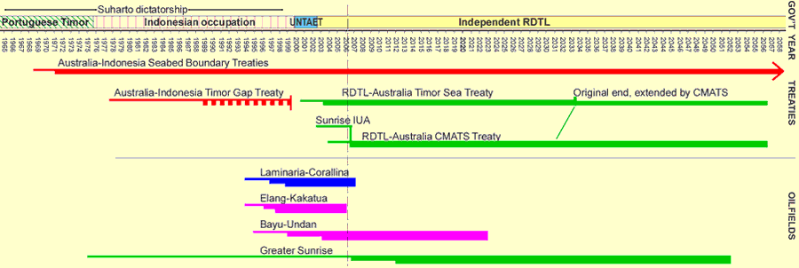 This diagram shows how negotiations and projects about oil reserves in the Timor Sea relate to historical events, from when Suharto took power until all the oil and gas in Timor-Leste's part of the Timor Sea will be used up. The line at the top represents historical periods -- the Portuguese, Indonesian, UNTAET and RDTL governments who ruled Timor-Leste. This is followed by a scale of years, from left to right. The next set of lines represents different treaties negotiated between Australia, Indonesia and Timor-Leste. Each line begins at the left when negotiations started. It gets thicker after ratification, when the treaty enters into force. The line extends rightward for as long as the treaty is in effect. The first two treaties were negotiated between Australia and Indonesia without Timorese participation. The 1972 boundary treaty is in effect indefinitely, and the illegal 1989 Timor Gap Treaty, originally planned to last until 2031, ended when Indonesia was forced out of Timor-Leste in 1999. The 2002 Timor Sea Treaty, 2003 Sunrise International Unitization Agreement (IUA) and 2006 Certain Maritime Arrangements in the Timor Sea Treaty (CMATS) were signed between Australia and Timor-Leste. Although the Timor Sea Treaty would have expired in 2033, it has been extended to 2056 by CMATS. The IUA has not been ratified, although it is incorporated in the CMATS agreement and will be in force during the same period. The next set of information is about the four principal oil and gas fields in the part of the Timor Sea which should belong to Timor-Leste under international legal principles. For each one, the line begins when the field was discovered, gets thicker after development begins, and reaches maximum thickness when the field is in production.
