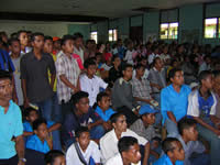 Briefing for engineering students at Universidade Nasional Timor-Leste, Hera campus, January 2004. UNTL mechanical engineering lecturer Constancio Antonio Pinto, who is also working at Bayu-Undan, tells students how the platforms operate.