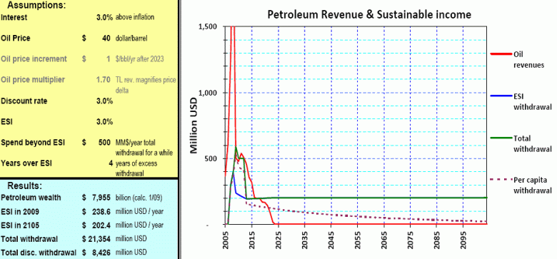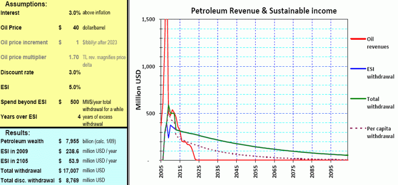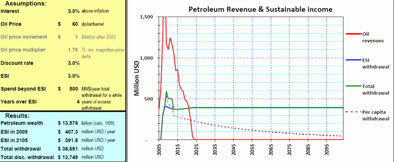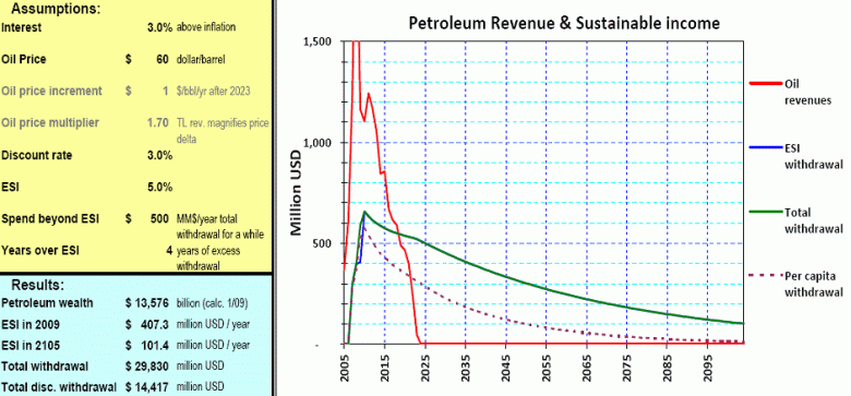 The third graph uses the Government's unrealistic oil price of $60/barrel. However, it illustrates what would happen if the Petroleum Fund Law was revised to allow a "sustainable" income withdrawal of 5% of Petroleum Wealth every year.
