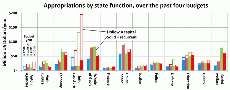 | Ministry of Infrastructure Capital Plans in State Budgets 2008-2011 (extract, thousands of USD) | Ministry | Project | 2008 | 2009 | 2010 | 2011 | 2012 | Total | Mid-Year Budget for 2008 (passed July 2008) | | | | | | | Infrastructure | Construction of Electricity Generating Centers | 5,000 | 35,000 | 35,000 | 30,000 | 0 | 105,000 | | Infrastructure | Construction of national distribution grid | 5,000 | 95,000 | 95,000 | 90,000 | 0 | 285,000 | State Budget for 2009 (passed January 2009) | | Infrastructure | Contruction of generators and national grid | | 85,000* | 160,000 | 120,000 | 0 | 365,000 | | 10,000 | 375,000 | | Infrastructure | Oversee project | | 2,000 | 2,000 | 2,000 | 0 | 6,000 | | Infrastructure | All capital & development | | 117,183 | 179,100 | 136,300 | 15,905 | | | Entire 2009 Budget | All capital & development | | 205,334 | 233,871 | 154,066 | 22,648 | | State Budget for 2010 (passed December 2009) | | Infrastructure | Construction of generators and national grid | | 15,000* | 48,000 | 0 | 0 | 48,000 | | | 10,000 | 73,000 | | Infrastructure | Oversee project | | 2,000 | 2,000 | 0 | 0 | 4,000 | | Infrastructure | All capital & development | | ? | 136,894 | 119,224 | 11,163 | | | Entire 2010 Budget | All capital & development | | ? | 216,920 | 146,932 | 12,650 | | | * During the third quarter of 2009, the allocation for the electricity project in the already-enacted 2009 state budget was decreased from $87 million to $17 million, with $70 million shifted to the Secretary of State for Public Works for the Pakote Referendum projects. See Budget Execution Report, page 42. |