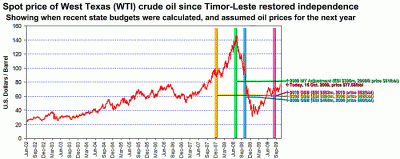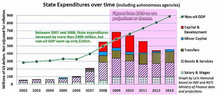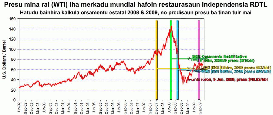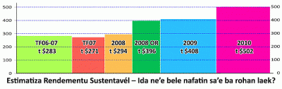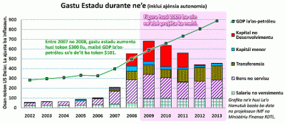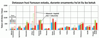 Dokumentu seluk importante | This is the first budget being enacted under Timor-Leste's just-passed Budget and Financial Management Law, (also Port.), Law no 13/2009. When the draft law was under discussion, La'o Hamutuk and other NGOs suggested improvements. The 2010 budget estimates the sustainable income (ESI) from the Petroleum Fund for 2010 at $502 million (an increase of $94 million since last year) and proposes to spend all of it, but not more. It also anticipates that during 2009, actual government expenditures will not exceed the ESI of $408 million. However, two weeks after the budget was submitted to Parliament the Government requested the BPA to transfer a total of $512 million from the Petroleum Fund during 2009, and La'o Hamutuk protested. Although the budget does not include an allocation for Timor-Leste to borrow from external sources, it discusses this for several pages and says that "loans will be used to finance infrastructure projects which are national priorities. The value of these projects is likely to be around $3bn over the term of the project life, which will be several years." This budget cuts the Capital and Development allocation for the Heavy Oil Power project drastically (see below), but is unclear how that project is to continue . However, later developments show that it will be expanded, and probably paid for with a loan. | Orsamentu 2010 primera vez TL uza lei kona ba Orçamento e Gestão Financeira foin promulga husi PR. Bainhira Parlamentu diskuti esboso lei ida ne'e, ONG sira fo ona sujestaun balu. Orsamentu tinan 2010 estimatiza rendimentu sustentavel (RSE/ESI) husi Fundu Petroleu ba tinan 2010 hanesan tokon $502 (aumenta tokon $94 husi tinan ikus), no planu atu gasta hotu, maibe la gastu barak liu. Dokumentu ida ne'e mos antisipa katak iha tinan 2009, Governu nia gasta la liu ESI 2009 (tokon $408). Maibe, semana rua tuir mai, Ministeriu Finansas haruka instrusaun ba ABP atu transfere tokon $512 husi Fundu Petroleu durante tinan 2009, no La'o Hamutuk protesta ona. Maske Orsamento ne'e la inklui ho alokasaun ba imprestimos Timor-Leste nian husi fontes esterno nian, maibe diskute hela ida ne'e ba pagina balun no hateten katak "imprestimos sei uza atu finansia projeitu infrastrutura nian nebe sai nudar prioridade nasional nian. Valor husi projeitu hirak ne'e hanesan besik $3 biliaun ba durasaun tempo projeitu ne'e la'o, nebe sei lao iha tinan balun." Ami hanoin Governu iha intensaun atu ba debe iha proposta ba Orsamento Rektifikativo nebe iha durante 2010. Orsamento ne'e kua drastiku ba Kapital Dezenvolvimento nian nebe aloka ba projeito eletrisidade oleo pezadu (hare iha kraik), maibe ne'e la klaru se projeitu ne'e bele kontinua. Maibe, akontese seluk indika katak projeitu ne'e atu sai boot liu, no selu husi imprestimos husi China. | Click on any graph below to see it larger