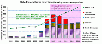 | Summary of Financing for the 2010 Combined Sources Budget (Adapted from Budget Book 1, page 36) | | 2009 | 2010 | 2011 | 2012 | 2013 | | Budget | Budget | Projection | Projection | Projection | Income | 1344 | 1481 | 1734 | 1761 | 1504 | Domestic revenue | 84.2 | 76.8 | 77.6 | 85.5 | 94.1 | Oil and gas revenue (paid into petroleum fund) | 1253 | 1393 | 1643 | 1659 | 1390 | Tax revenues | 1057 | 1144 | 1359 | 1349 | 1069 | Royalties and interest | 196 | 249 | 284 | 310 | 321 | Autonomous agencies own revenue | 6.9 | 10.5 | 13.0 | 16.2 | 19.5 | Budget support from donors | 0 | 0 | 0 | 0 | 0 | Expenditure (including autonomous agencies) | 901.8 | 765.6 | 652.0 | 460.1 | 438.5 | Recurrent expenditure | 642.5 | 513.3 | 453.9 | 433.7 | 435.6 | Salary and wages | 93 | 97.7 | 100 | 103 | 105 | Goods and services | 248 | 207.7 | 216 | 225 | 234 | Transfers | 96 | 85.9 | 89 | 93 | 97 | Donor projects | 203 | 122 | 48 | 13 | 0 | Capital expenditure | 259.3 | 252.3 | 198.1 | 26.4 | 2.7 | Capital minor | 38 | 28.8 | 48 | 13 | 0 | Capital major | 205 | 216.9 | 147 | 13 | 3 | Donor projects | 18 | 7 | 2 | 1 | 0 | Overall balance | 442 | 715 | 1082 | 1300 | 1065 | Non-oil balance (deficit) | -810.7 | -678.3 | -561.4 | -358.5 | -324.9 | Financing of non-oil balance | 810.7 | 678.3 | 561.4 | 358.5 | 324.9 | Oil fund financing (transfers from petroleum fund) | 589 | 502 | 499 | 497 | 495 | Project financing by donors | 221.0 | 128.7 | 50.7 | 13.9 | 0.2 | Changes in treasury cash-balances | 0.7 | 47.7 | 11.7 | -152.4 | -170.3 | LH note: Capital and donor projections for future years are apparently incomplete. The preceding line appears to contemplate carry-over in 2010, and perhaps deficit financing in 2012 and 2013. |