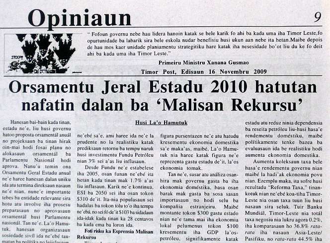 | Iha loron 21-22 Outubru, Komisaun C Parlamento nia halao Konferensia ida kona ba Banku Central, imprestimos no fo imprestimos no Orsamento Geral Estado 2010. konferensia ne'e remata husi apresentasaun husi La'o Hamutuk (no mos Ingles) i loke no taka ofisialmente husi Vice Presidente Parlamento Nasional Vicente Guterres. Komisaun C aceita ba La' o Hamutuk atu inklui sira nia apresentasaun ( hotu-hotu iha Ingles so La'o Hamutuk nian) iha ami nia website, hanesan tuir mai: | Mr. Abraão de Vasconselos, Autoridada Bancaria no Pagamentu | The Role of the Banking and Payment Authority Investment Management of the Petroleum Fund | | Mr. Habib Rab, Banku Mundial | Debt Management | | Mr. Francisco S. Soares, Min. Finansas | The General Budget of the State 2010 | | Mr. João Saldanha, Min. Finansas | Macroeconomic Framework | | Mr. Agostinho Castro, Min. Finansas | Highlights of the 2010 Budget Estimates and National Priorities of the 2010 Budget | | Mr. Enomoto Hiroshi, Japan International Cooperation Agency (JICA) | Government Lending Practices and Experiences (Japanese Experience) | | Mr. Rui Gomez, Pro Poor Policy Unit, UNDP | The 2010 National Priorities, Poverty Reduction and MDGs and the Proposed Budget 2010 | Ms. Elaine Tan, UNIFEM Ms. Endah Agustiana, UNDP Parl. Project Ms. Fe Gaffud, UNDP Parl. Project | Gender Responsive Budgeting – Proposed 2010 Budget | Mr. Charles Scheiner, La'o Hamutuk | Comments on the Proposed Budget 2010 (mos English) |