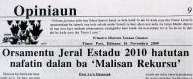Parlamentu diskuti ona amendamentu balu, no aprova orsamento tomak iha loron 3 Dezembru. Sira aumenta gastus ho tokon $23, entaun total agora tokon $660. Governo fo Komunikadu Imprensa (Port.) ho detailu. Presidente Republika promulga ona Lei OJE 2010 iha loron 15 Dezembru, 2009. La'o Hamutuk sei kontinua atu haluhan liutan analiza no komentariu iha pagina web ne'e. Haree mos Timór-Leste atu Debe: Lojika ka La’e? husi La’o Hamutuk loron 25 Nov. 2009. |