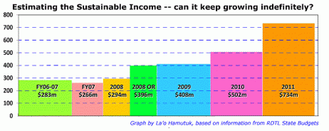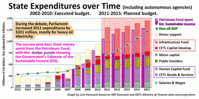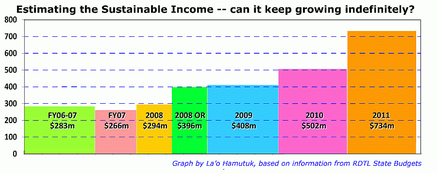 For 2010, Timor-Leste operated under two state budgets. In July, the $660 million allocated for expenditures at the end of 2009 was increased by 27%, to $838 million, in the July mid-year rectification, which also increased the amount to be withdrawn from the Petroleum Fund during 2010 to $811 million, $309 million more than the Estimated Sustainable Income for the year. [Click here for notes on the graphic at right.] The Government also had significant problems carrying out its programs. As described in the Budget Execution Report for the first half of 2010, the Government had spent only 30% of the original budget allocation during six months. In order to execute the entire rectified budget by the end of 2010, the Government will have to spend money three times faster that has been. In other words, after spending $1.1 million/day from January to June, spending from July to December will have to average $3.5 million/day to execute the budget. (For reference, spending during 2009 averaged $1.66 million/day, including the ineffective Pakote Referendum.) La'o Hamutuk believes that saving the people's money is better than wasting it, and we do not encourage rapid spending without planning or results. However, the results this year are not encouraging. Notwithstanding the Prime Minister showing people in every subdistrict that physical infrastructure will be the main component of the National Strategic Development Plan, the Ministry of Infrastructure only executed 9% of its $137 million Capital and Development Budget in the first half of the year. If one leaves out the $50 million allocated to the problematic new heavy oil project, less than 2.5% of the $87 million allocated for all other infrastructure capital projects (water, roads, flood control, communication, bridges, etc.) was spent. Last year, Timor-Leste enacted a Budget and Financial Management Law (also Port.), which includes a calendar for enacting the budget which requires the Government to submit the budget to Parliament by 15 October. In late September, Parliament accepted the Prime Minister's request to delay this by a month (law in Portuguese), reducing the time for discussion of the 2011 budget. The Ministry of Finance originally hoped for total state expenditures of $714.7 million during 2011. (Table 2.7 in the draft Strategic Development Plan projects $838.2 million.) However, the requests from each ministry added up to about $1,500 million, which was negotiated downward to $985 million. The Government changed the underlying assumptions for Estimating the Sustainable Income, using less prudent assumptions to increase the ESI by $232 million, to $734 million, and anticipates $110 million in non-oil revenues. During 2009 and 2010, the Government transferred more than the ESI out of the Petroleum Fund into their operating account. The proposed 2011 budget stays within the enlarged ESI by filling the deficit with $141 million from past withdrawals from the Petroleum Fund.