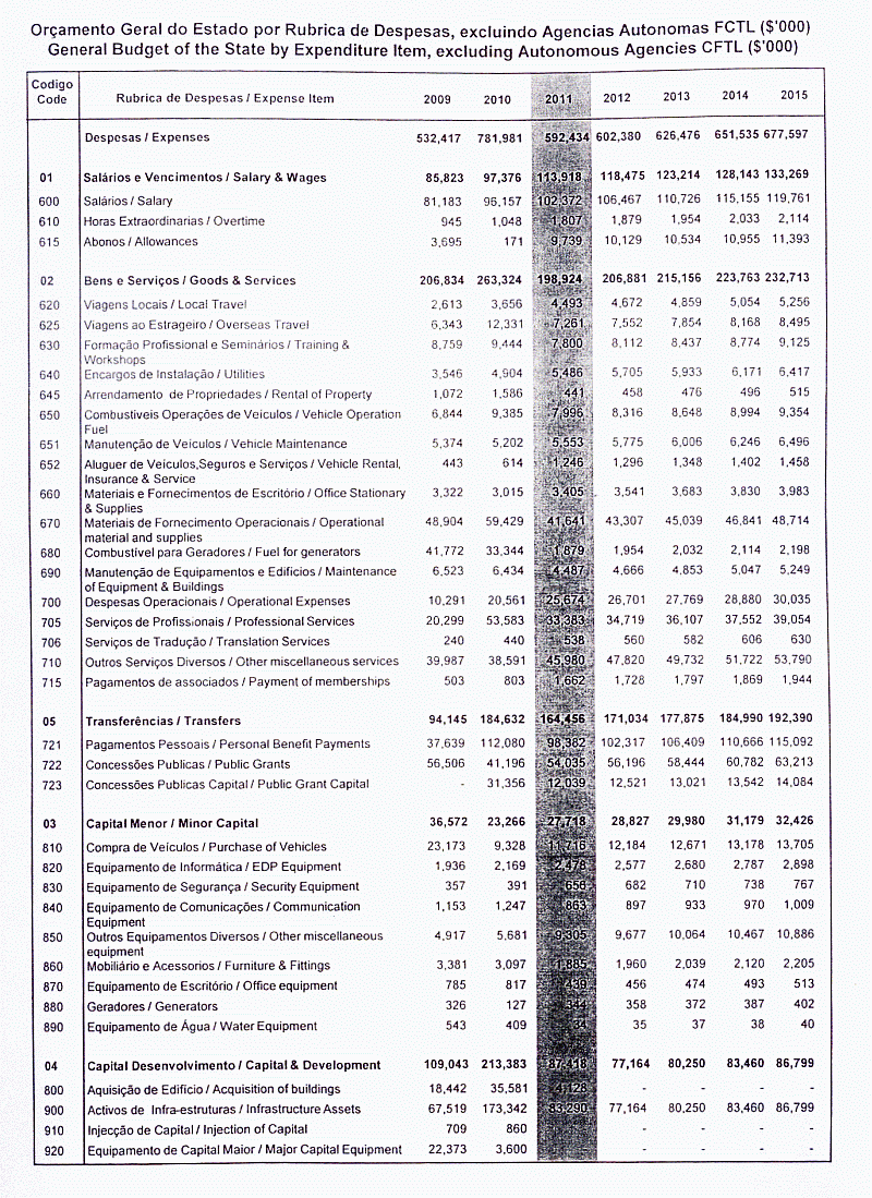 The Ministry of Finance declined to make the budget documents available, but La'o Hamutuk obtained copies from members of Parliament and has scanned, translated and posted key documents here as downloadable PDFs. Skip down for final budget documents. Click here for the entire Budget Book 1 (1.5 MB) in English, including the law and its annexes. You can also download individual parts of Book 1 as follows: We did not scan Books 2 (annual action plans), 3 (districts), 4 (department-level expenditures), or 5 (development partners support), although some of these were later web-published by the Ministry of Finance. However, we have done the following Parliamentary Committees On 26 November, La'o Hamutuk was invited by Committee D (Agriculture, Forests, Natural Resources and Environment) of the National Parliament to share perspectives about the budget. After the hearing, we prepared a submission for the Committee (also Tetum). On 14 December, La'o Hamutuk wrote a letter to the IMF to provide new information for their recent “Report on Observance of Standards and Codes (ROSC)—Fiscal Transparency Module” and “Public Financial Management—Performance Report” on Timor-Leste. The IMF responded in January: "Thank you very much for your in-depth review... We very much appreciate La'o Hamutuk's constructive input and dialogue on public financial management issues. With your government's permission, we hope to continue that dialogue in coming years." The IMF's annual report on Timor-Leste's economy was eventually released in March 2011, too late to inform the budget discussions. On 15 December La'o Hamutuk testified to Committee C (Economy and Finances) of the Parliament, presenting a more detailed submission (also Tetum) than we had provided earlier, discussing the following: Spending at this level is unwise and unsustainable. The budget makes imprudent assumptions about oil prices. The proposed revision of the Petroleum Fund Law threatens fiscal sustainability. The Infrastructure Fund undercuts Parliamentary authority. The national electric project is much more expensive than it appears. The “Tasi Mane” project is a troublesome foot in the door. The PETRONATIL National Oil Company is dangerous and problematic. The Institute for Petroleum and Geology should be a normal Government department. The Infrastructure Fund undercuts Parliamentary authority. The Human Capital Development Fund prioritizes the state over our citizens. Parliament and the public must have access to full information. Key state institutions must continue to grow.
