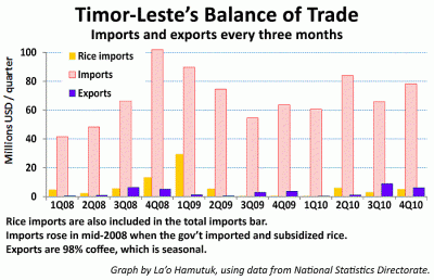 Dependency on imports is unhealthy and unsustainable. Today, agriculture and industry in Timor-Leste cannot provide for our daily needs. This graph is based on official statistics; in reality, imports were probably 50% higher than the $283 million reported for 2009, while exports were less than $10 million. If we cannot produce our own food, water, cement, and other basic necessities, how will we survive when we have no oil money to pay for buying them from overseas?