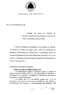 "For these reasons, the judges of the Court of Appeal have deliberated that the Decree of the National Parliament No 45/II approving the 2011 State budget submitted to the President of the Republic does not violate Articles 145.2 and 115 of the Constitution, nor Article 9 of Law 9/2005 of 3 August (on the Petroleum Fund)."
