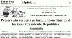 On the same day, Court of Appeals President Claudio Ximenes asked Parliament for their views (also Portuguese). Timorese journalists and politicians made many uninformed political pronouncements on this issue, charging that the President was interfering with the functioning of the state. La'o Hamutuk believes that it is essential for the rule of law to apply in Timor-Leste, so we published an article We Must Respect the Constitutional Principles of the President’s Duties (Tetum original) in Timor Post and Diario Nacional on February 11, answering some basic questions: