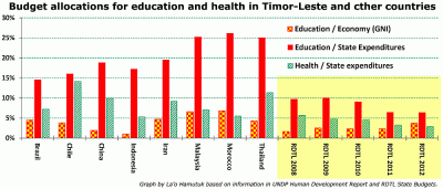 Sadly, Timor-Leste 2012 State Budget continues to lack sufficient attention to Timor-Leste's human resources which are the foundation of economic development, as well as essential to our people's quality of life. Only 6.3% of state expenditures will go for education (including the Ministry and scholarships), and only 2.9% for health. As the graph shows, this is slightly less than last year's percentage and much less than other developing countries. Although Timor-Leste is spending a few more dollars on education and health than in past years, other parts of the budget have grown much faster. Last May, the UNDP National Human Development Report pointed out that countries making progress toward the MDGs spend about 28% of their budgets on education and health, concluding that “not enough priority is being accorded to education and health. If Timor-Leste is to move faster in achieving the MDGs in these areas, then the share of social services in the budget will have to be virtually doubled.” The 2012 budget moves in the opposite direction, reducing the budget allocation for these social services from 9.6% of the 2011 budget to 9.2% for next year. The new Timor-Leste Investment Company (CITL) was proposed to get $200 million in start-up capital (but Parliament cancelled it). The Council of Ministers (also Portuguese) approved Decree-Law 41/2011 (also Portuguese) establishing this entity on 3 June 2011, and it became effective when it was published in the Jornal da Republica on 21 September. The Government says that the CITL/TLIC will "promote the development of investment opportunities and national wealth growth, leading important strategic projects with significant commercial impact." On 11 June, the Government celebrated TLIC as being "born to attract foreign direct investment by providing commercial incentive, through which the Government and the People have ownership. Similar to Singapore’s Temasek Holdings, a domestic, Government owned Investment Corporation, TLIC will target sector investment aligned to need and return and invest accordingly on a strictly commercial basis to accelerate development. TLIC can partner to build hotels, factories or other commercial pursuits. The TLIC mandate, unlike the Petroleum Fund, is to invest in Timor-Leste, in this phase of development." The Strategic Development Plan calls it the Timor-Leste Investment Agency, and has little information. Budget Book 1 and the Decree-Law and Statutes give a little more, although TLIC/TLIA is not mentioned in 384 pages of Ministry Action Plans for 2012. The Budget allocates the $200 million capital injection under "Whole of Government;" the following is an abridged version of its explanation: