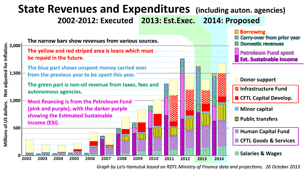 MF halo aprezentasaun Panorama OJE2014 ba seminar Parlamentu nian iha loron 24 Outubru. Governu haruka ona proposta OJE 2014 ba Parlamentu Nasional iha loron 25 Outubru, no Ministériu Finansas publika livru orsamentu neen ba sira nia website iha loron hanesan (MF hasai sira iha fulan Fevreiru 2014, maske verzaun final mai iha Marsu de'it). Livru OJE la inklui projeksaun kona-ba ezekusaun durante 2013, entaun La'o Hamutuk estimatiza ba gráfiku ida ne'e. Hare iha kraik be vezaun final hetan aprovasaun ona.