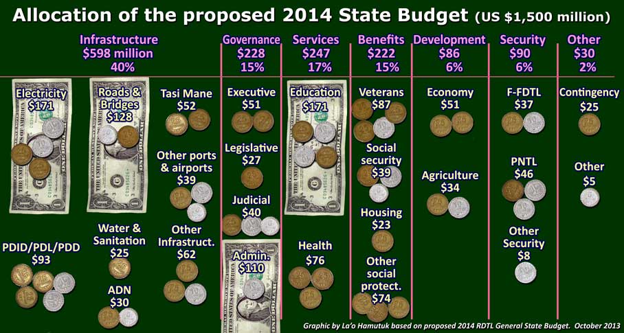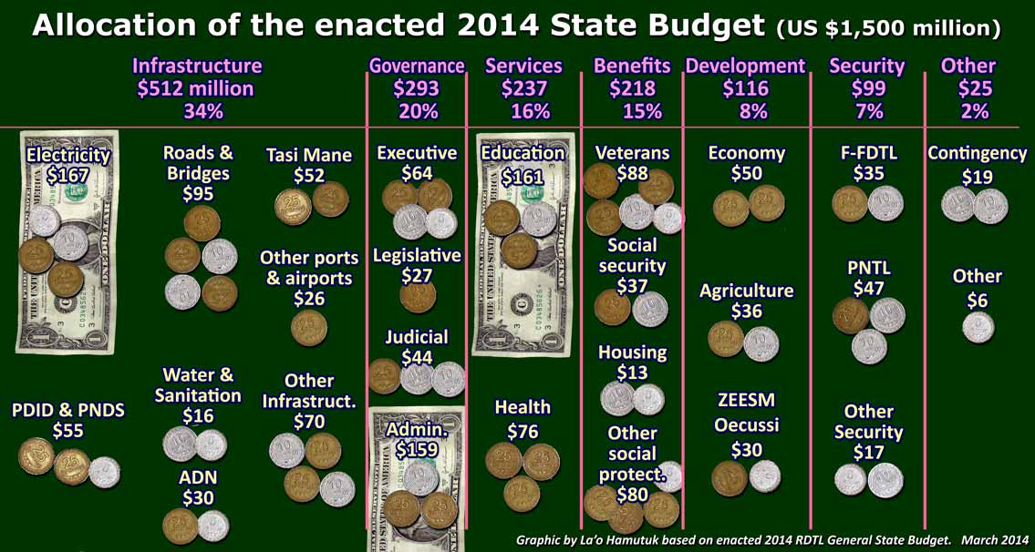 | The budget is significantly improved over recent years. In addition to larger allocations for education and health, infrastructure planning is becoming more realistic. | Orsamentu ne’e iha mudansa ne’ebé signifikante hadi’ak kompara ho tinan hirak kotuk ne’e. Aleinde ba alokasaun barak ba edukasaun no saúde, planeamentu infrastrutura sai realistiku liu. | The South Coast Highway may have been postponed indefinitely, although some inappropriate megaprojects continue and the 2014 budget allocates hundreds of millions for new ones: | Project | 2014 appropriation | 2014-2018 expenditure | | Suai Supply Base | $18m | $291m | | Suai airport | $20m | $65m | | MDG-Suco housing | $23m | $137m | | Oecussi development (only part) | $24m | $82m | | Dili airport | $10m | $355m* | | Tibar port | $8m | $148m* | | The last three projects will use additional financing from investors and/or loans. |