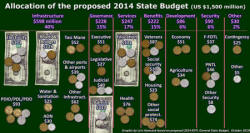 | 2014 Budget Process At an "Extraordinary Meeting" on 14 June, the Council of Ministers approved the $1.3 billion fiscal envelope for the 2014 State Budget. The Ministry of Finance had presented the table at right (click to see it larger) at Yellow Road workshops a few months earlier, and we're told it's what the Council agreed to.